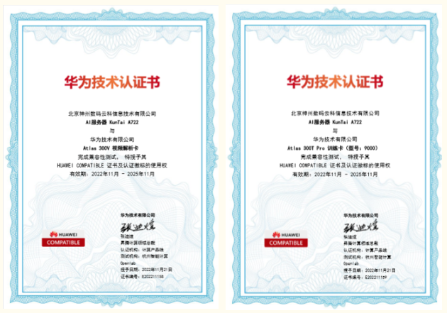 近日,金年会 A722服务器通过华为“Atlas 300V 视频解析卡”以及“Atlas 300T Pro 训练卡(型号:9000)”两项技术认证,为智能算力再添新力!